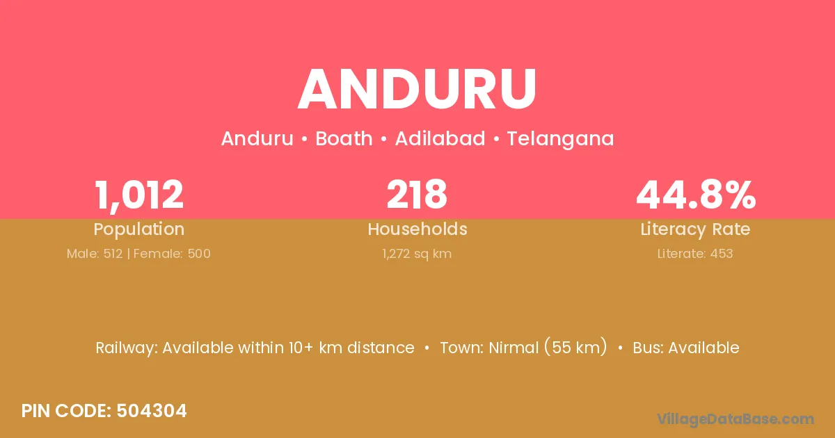 Nirmal (55 km) is the nearest town to Anduru village for major economic activities and is located approximately 55 km away.