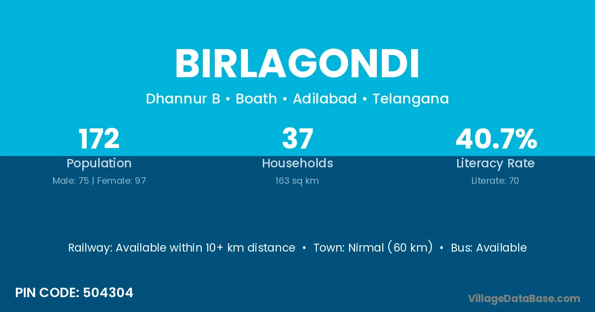 Nirmal (60 km) is the nearest town to Birlagondi village for major economic activities and is located approximately 60 km away.