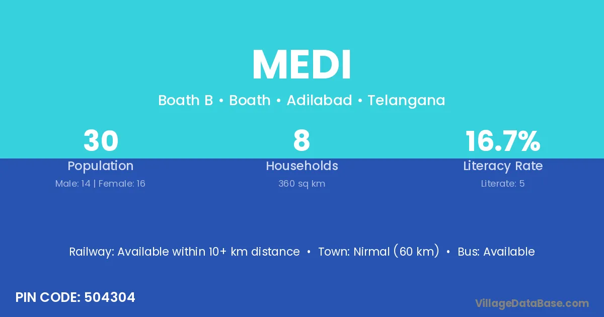 Nirmal (60 km) is the nearest town to Medi village for major economic activities and is located approximately 60 km away.
