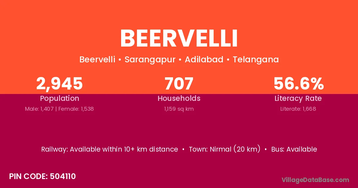 Mancherial (60 km) is the nearest town to Beervelli village for major economic activities and is located approximately 60 km away.