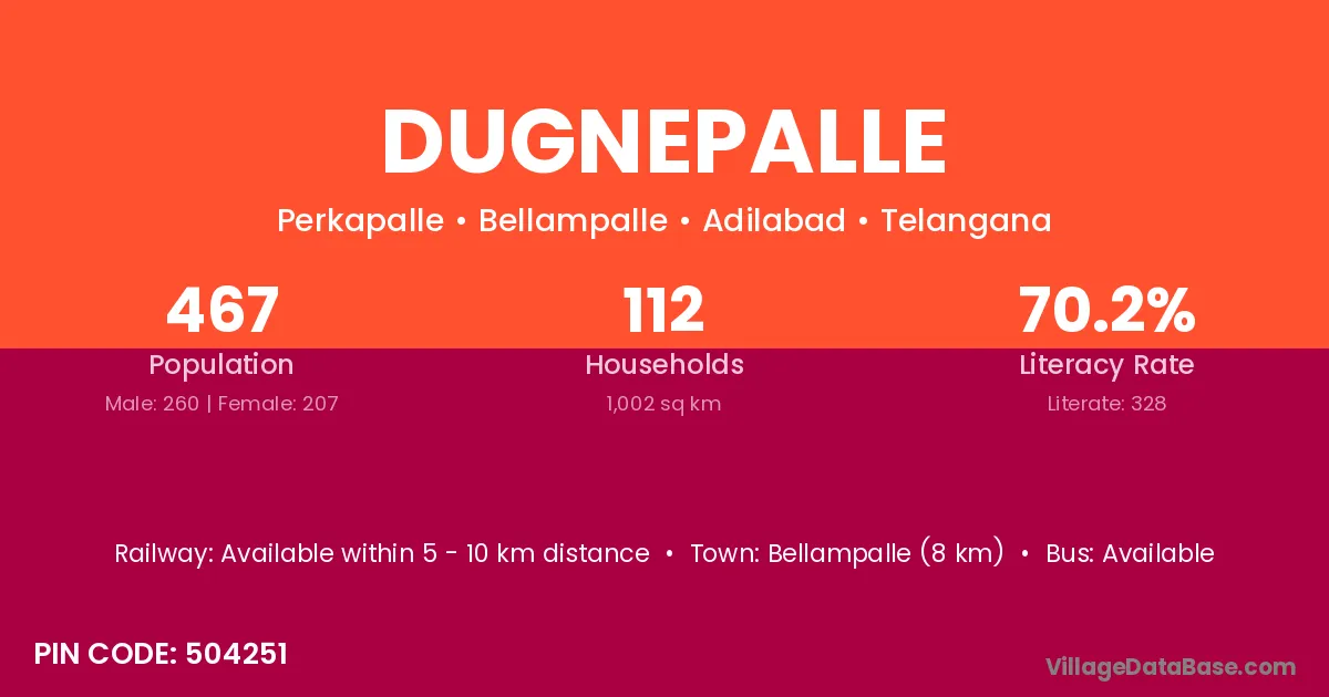 Mancherial (56 km) is the nearest town to Dugnepalle village for major economic activities and is located approximately 56 km away.