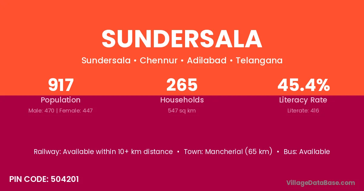 Mancherial (65 km) is the nearest town to Sundersala village for major economic activities and is located approximately 65 km away.
