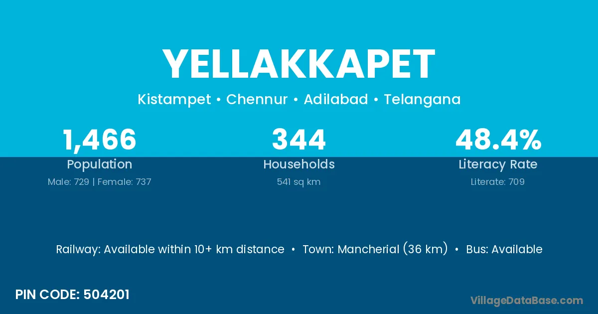 Mancherial (36 km) is the nearest town to Yellakkapet village for major economic activities and is located approximately 36 km away.