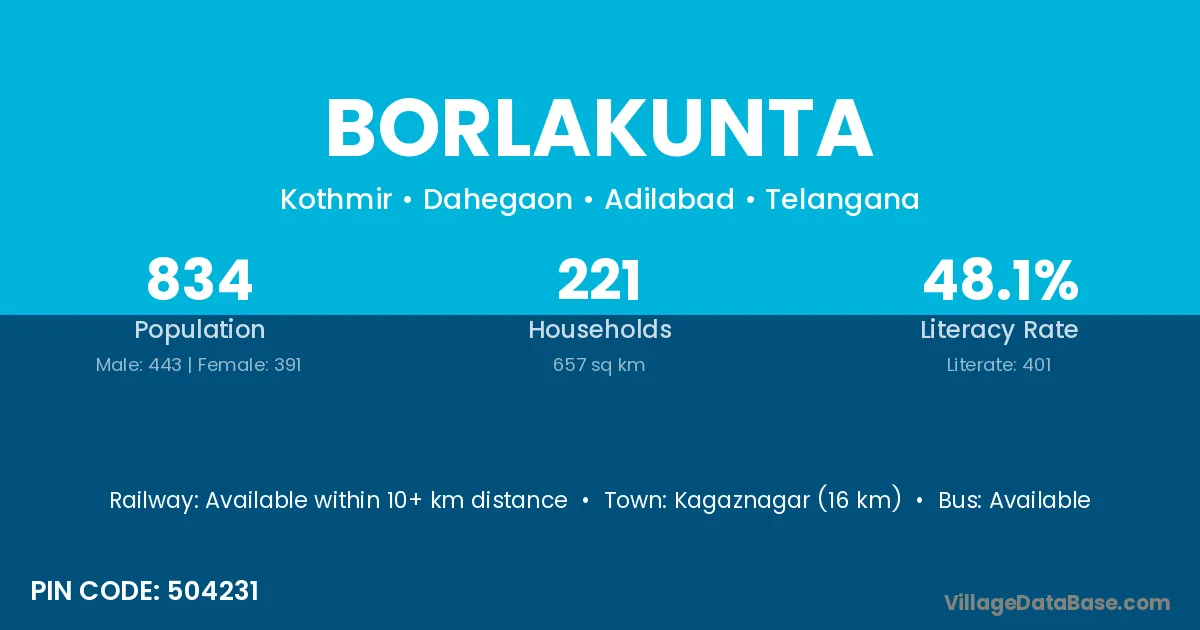 Kagaznagar (16 km) is the nearest town to Borlakunta village for major economic activities and is located approximately 16 km away.