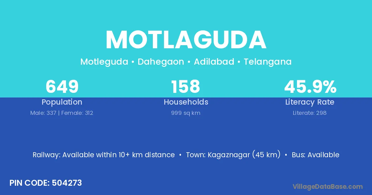 Kagaznagar (45 km) is the nearest town to Motlaguda village for major economic activities and is located approximately 45 km away.