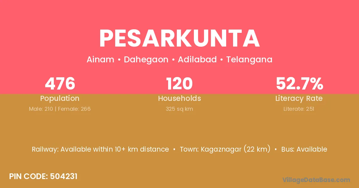 Kagaznagar (22 km) is the nearest town to Pesarkunta village for major economic activities and is located approximately 22 km away.