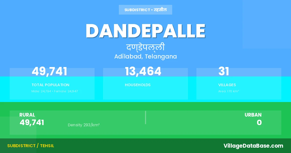 According to the 2011 census The total area of Dandepalle Mandal is 170 km², with a population of 49741 people. The population density is 293 inhabitants per square kilometre, and there are approximately 13464 houses in the sub district.
