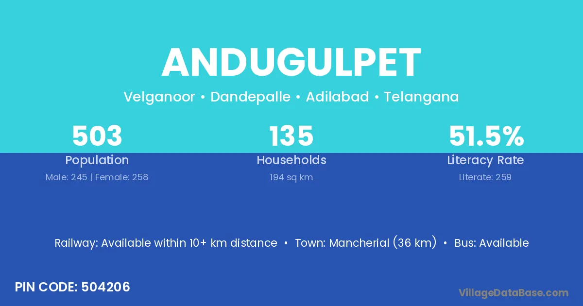 Mancherial (36 km) is the nearest town to Andugulpet village for major economic activities and is located approximately 36 km away.