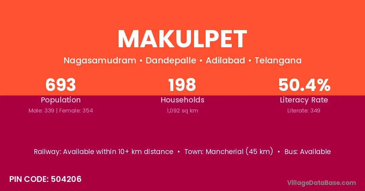 Mancherial (45 km) is the nearest town to Makulpet village for major economic activities and is located approximately 45 km away.