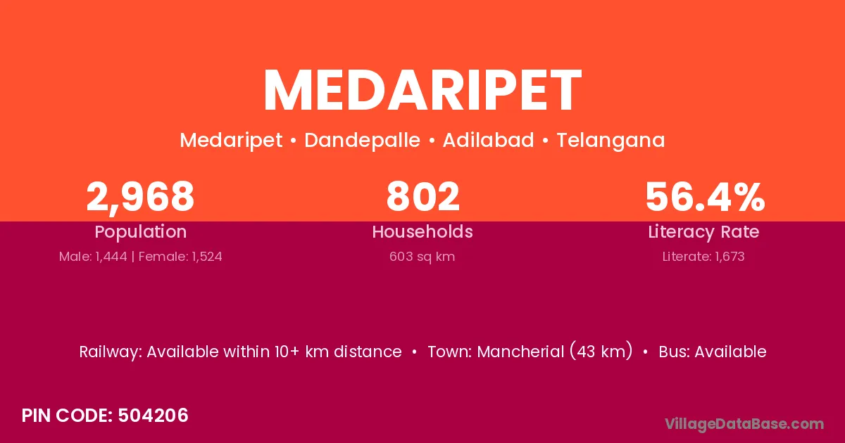 Mancherial (43 km) is the nearest town to Medaripet village for major economic activities and is located approximately 43 km away.