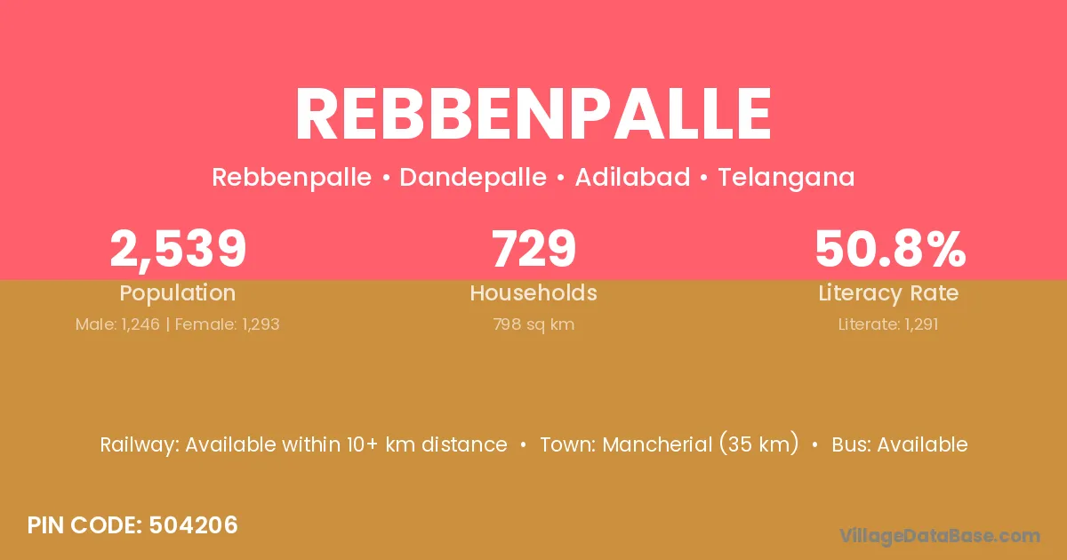 Mancherial (35 km) is the nearest town to Rebbenpalle village for major economic activities and is located approximately 35 km away.