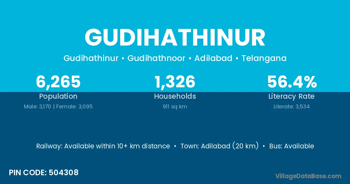Adilabad (20 km) is the nearest town to Gudihathinur village for major economic activities and is located approximately 20 km away.