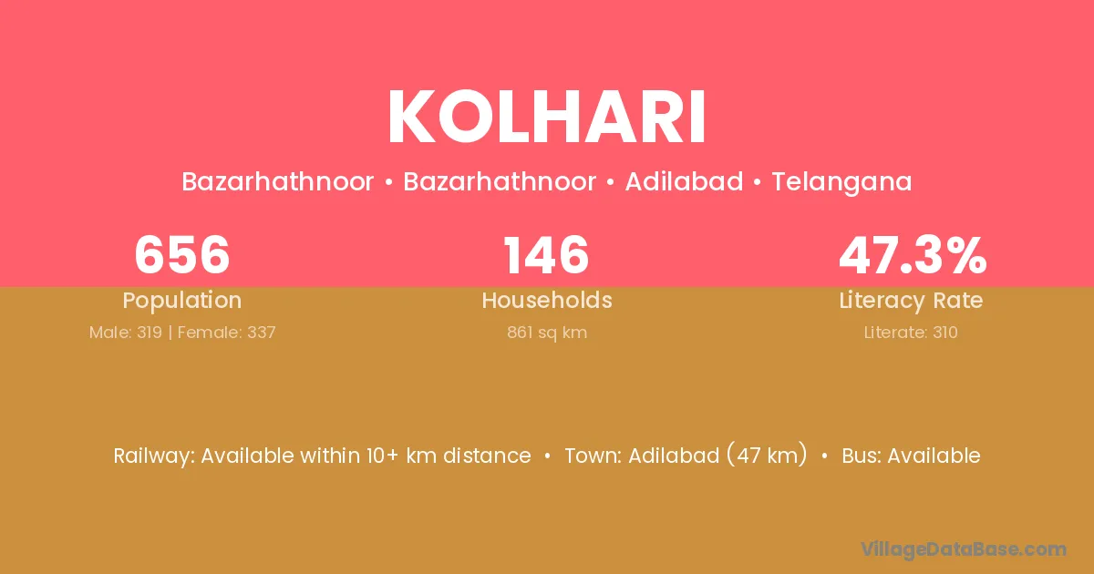 Adilabad (26 km) is the nearest town to Kolhari village for major economic activities and is located approximately 26 km away.