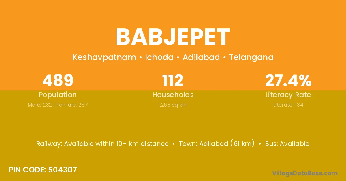 Adilabad (61 km) is the nearest town to Babjepet village for major economic activities and is located approximately 61 km away.