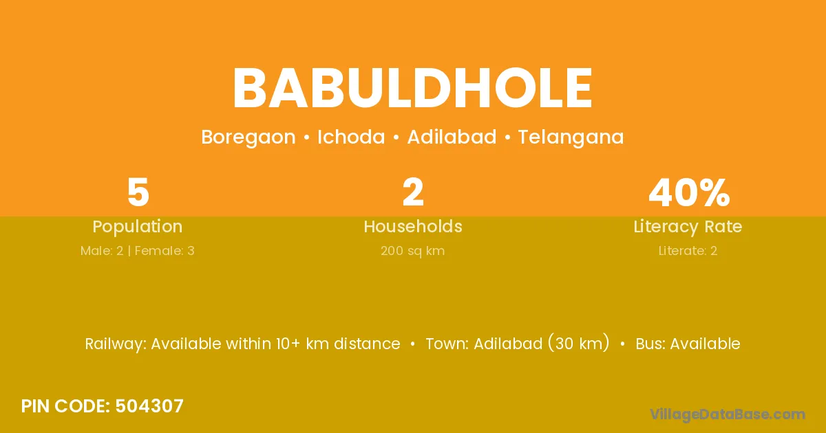Adilabad (30 km) is the nearest town to Babuldhole village for major economic activities and is located approximately 30 km away.