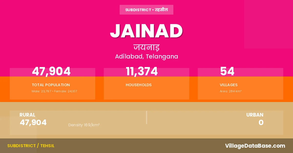 Jainad is a town and Mandal in the Adilabad district of the Telangana. In India, a Mandal is a subdivision of a district responsible for the administration and revenue collection of a specific area within the district. Mandals play a crucial role in the local governance structure, contributing significantly to the development and administration of their communities.