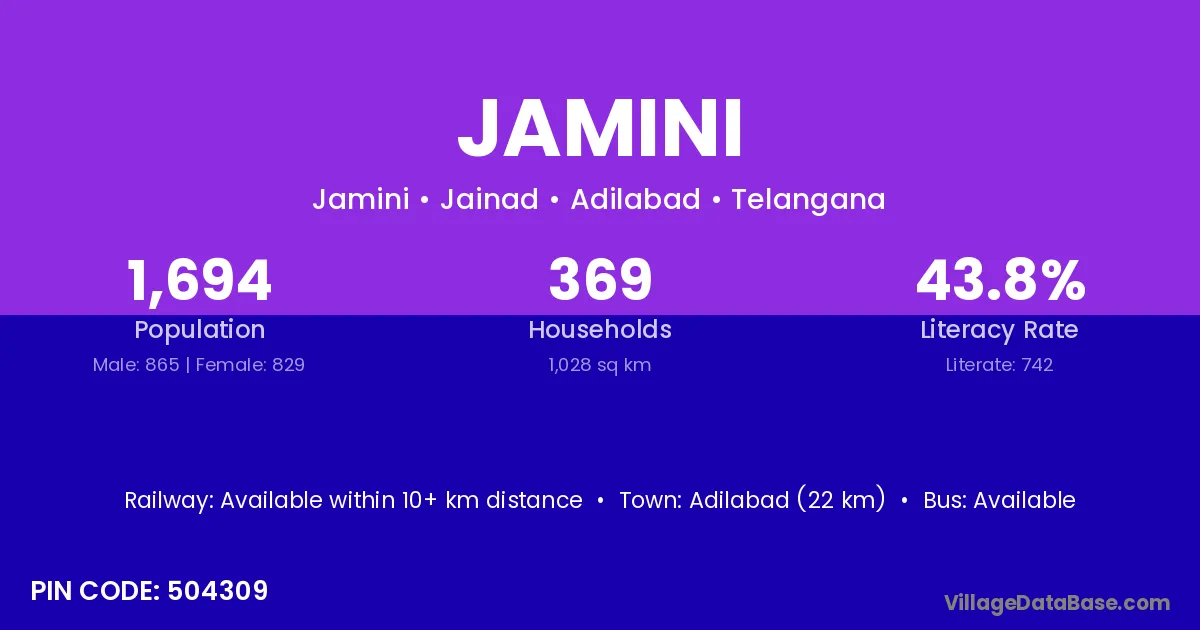 Adilabad (22 km) is the nearest town to Jamini village for major economic activities and is located approximately 22 km away.