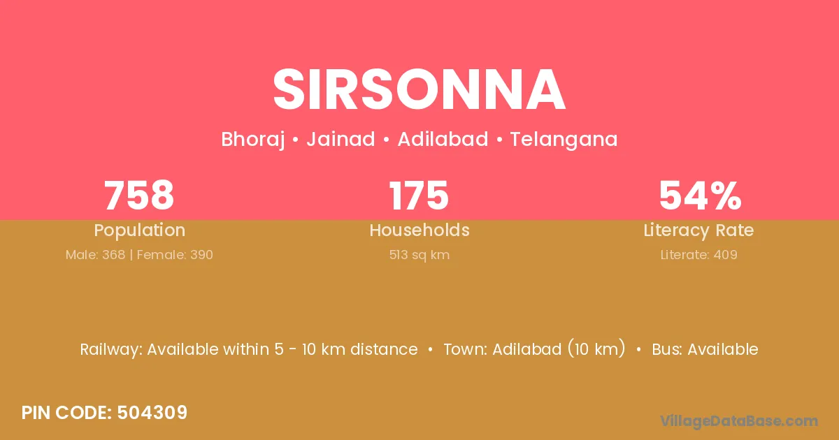 Adilabad (10 km) is the nearest town to Sirsonna village for major economic activities and is located approximately 10 km away.