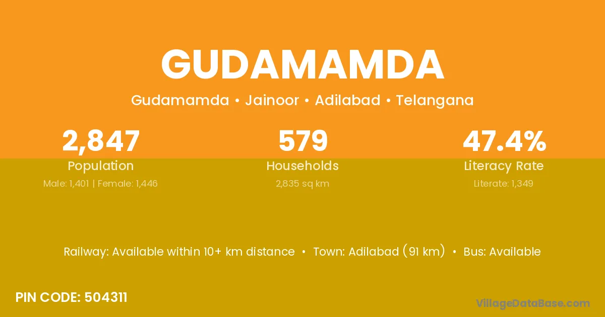 Adilabad (91 km) is the nearest town to Gudamamda village for major economic activities and is located approximately 91 km away.