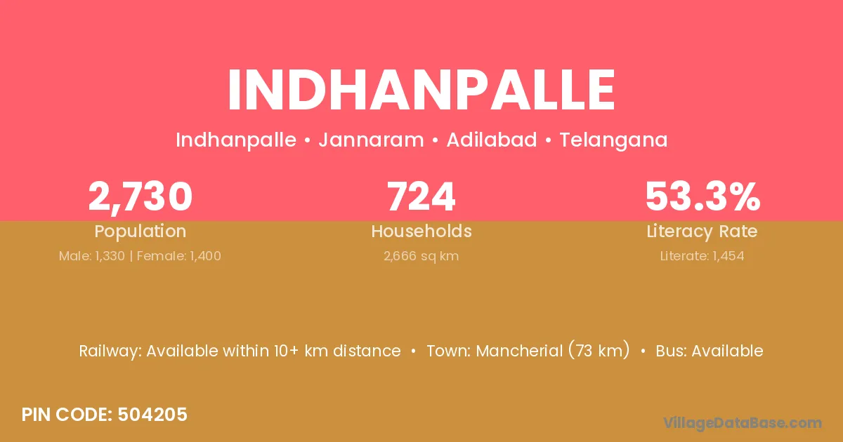 Mancherial (73 km) is the nearest town to Indhanpalle village for major economic activities and is located approximately 73 km away.
