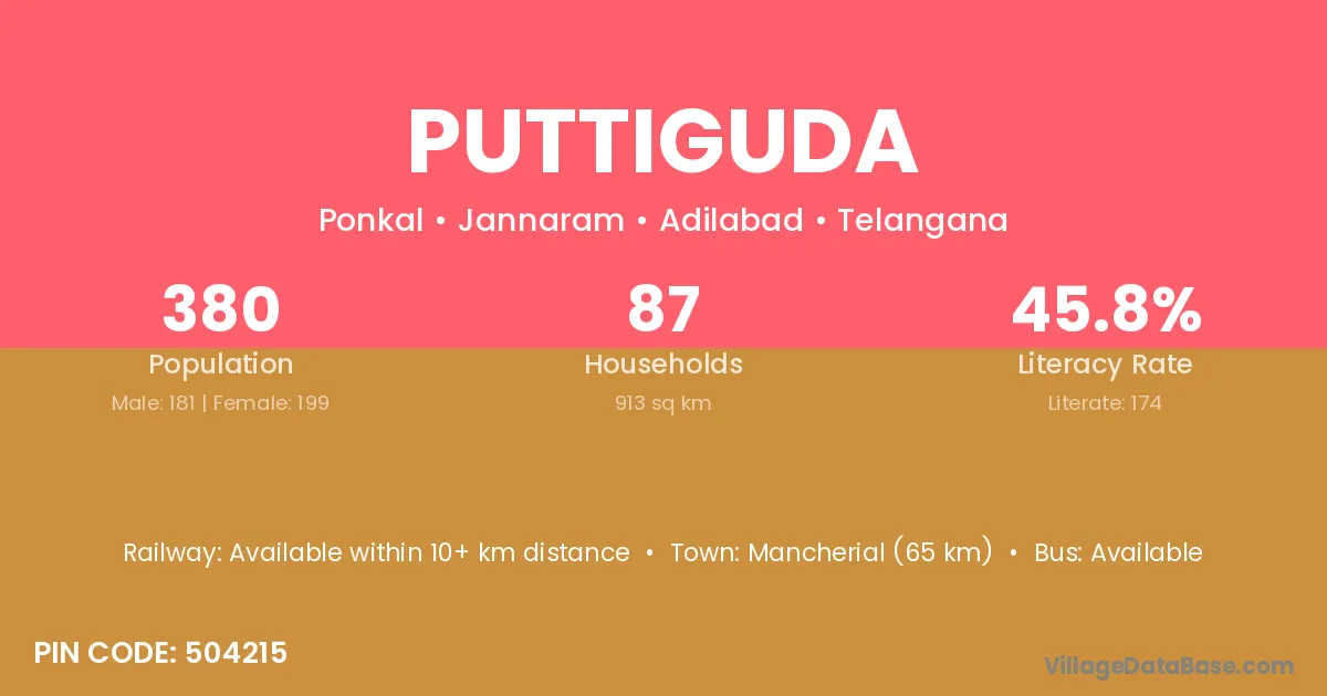 Mancherial (65 km) is the nearest town to Puttiguda village for major economic activities and is located approximately 65 km away.