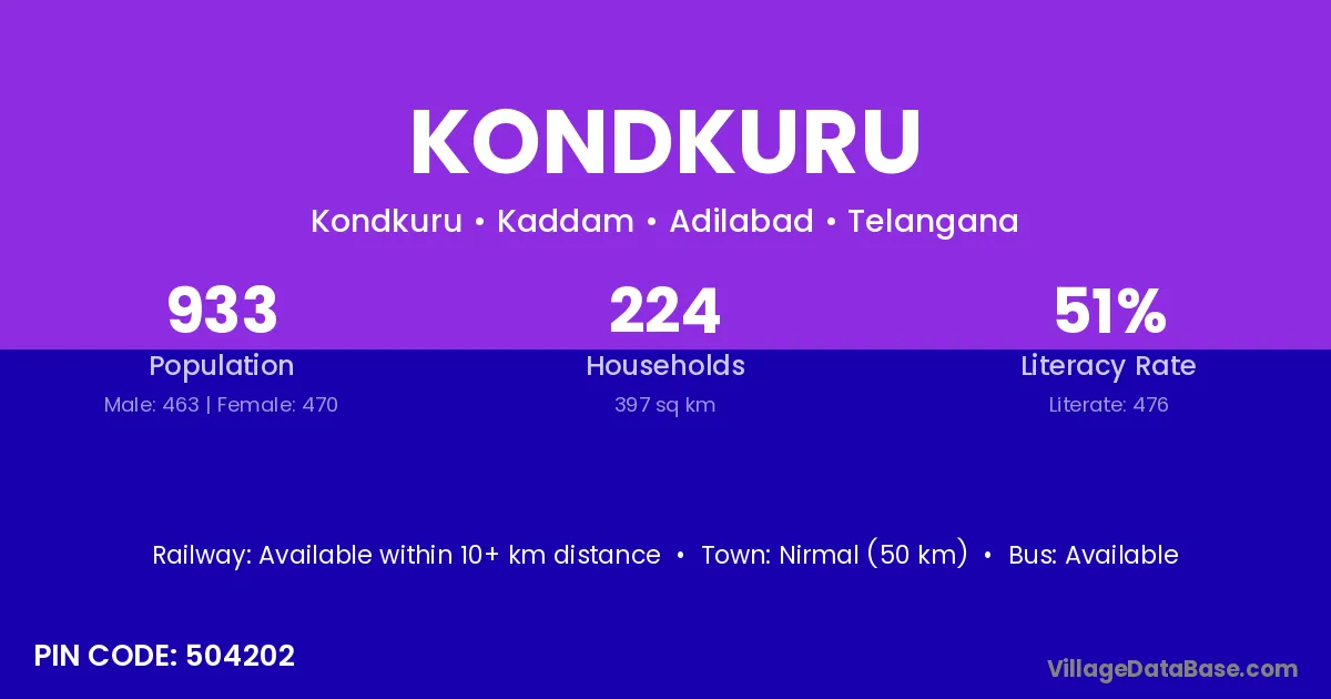 Nirmal (50 km) is the nearest town to Kondkuru village for major economic activities and is located approximately 50 km away.