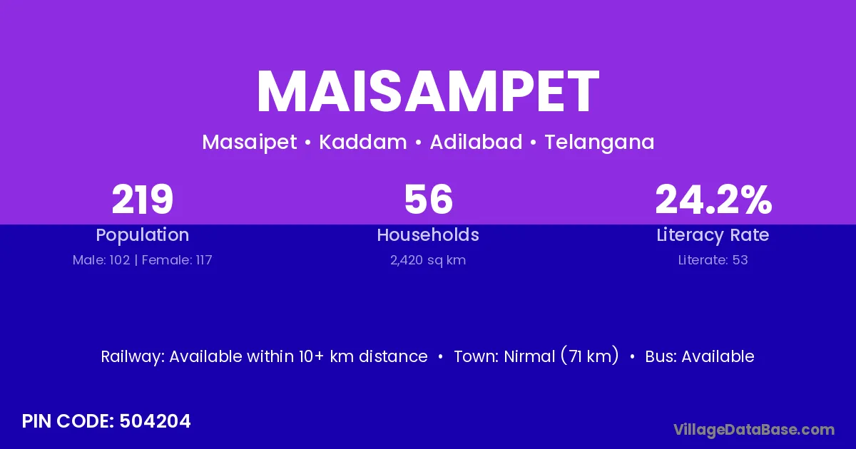 Nirmal (71 km) is the nearest town to Maisampet village for major economic activities and is located approximately 71 km away.