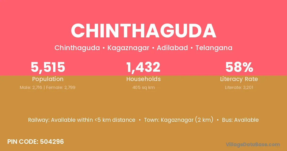 Kagaznagar (2 km) is the nearest town to Chinthaguda village for major economic activities and is located approximately 2 km away.