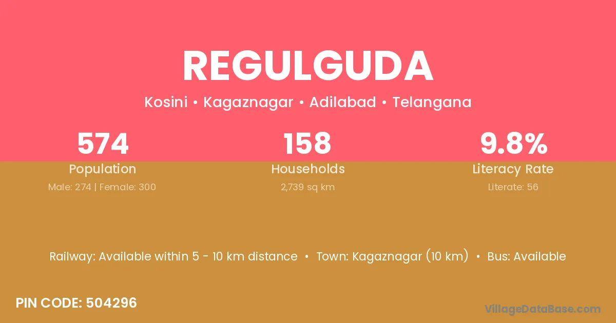 Kagaznagar (10 km) is the nearest town to Regulguda village for major economic activities and is located approximately 10 km away.