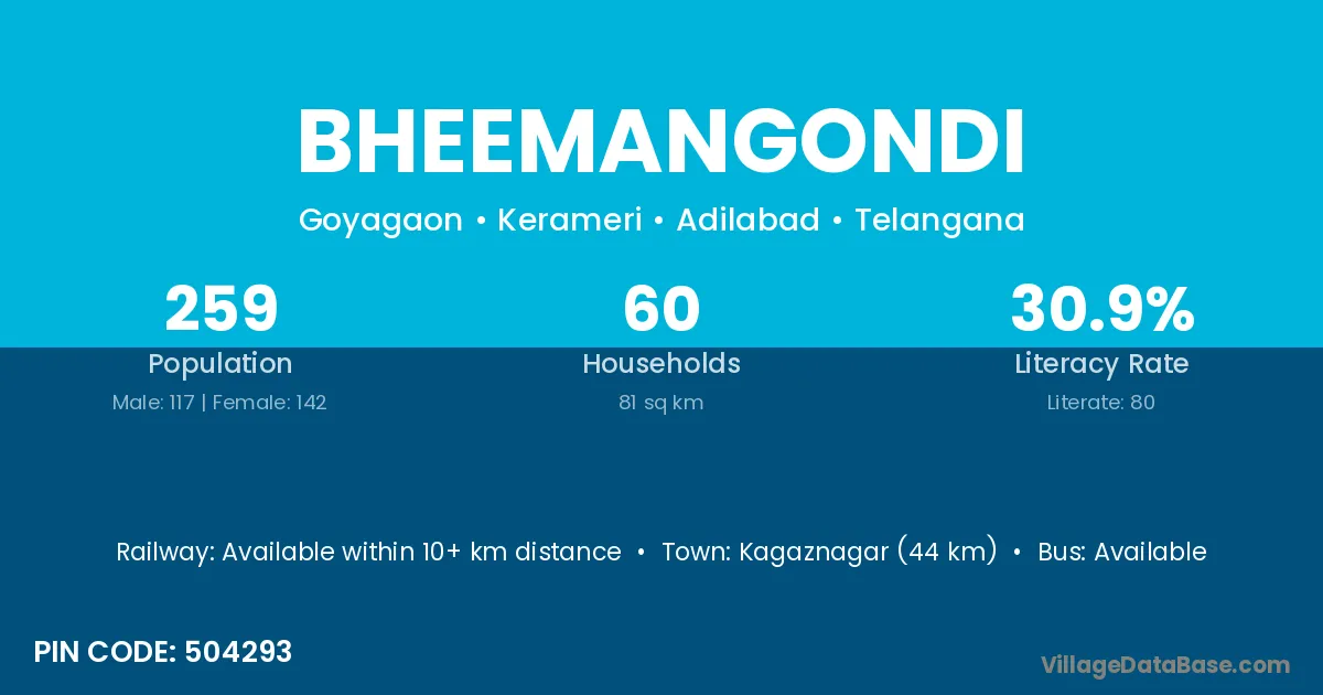 Kagaznagar (44 km) is the nearest town to Bheemangondi village for major economic activities and is located approximately 44 km away.
