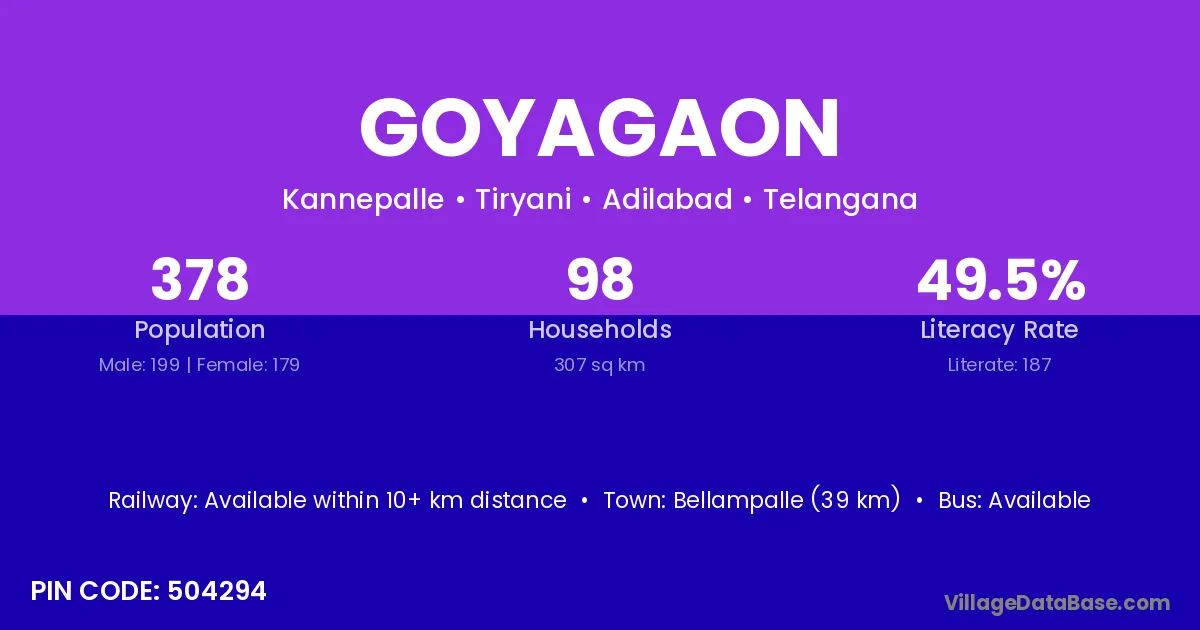 Kagaznagar (42 km) is the nearest town to Goyagaon village for major economic activities and is located approximately 42 km away.
