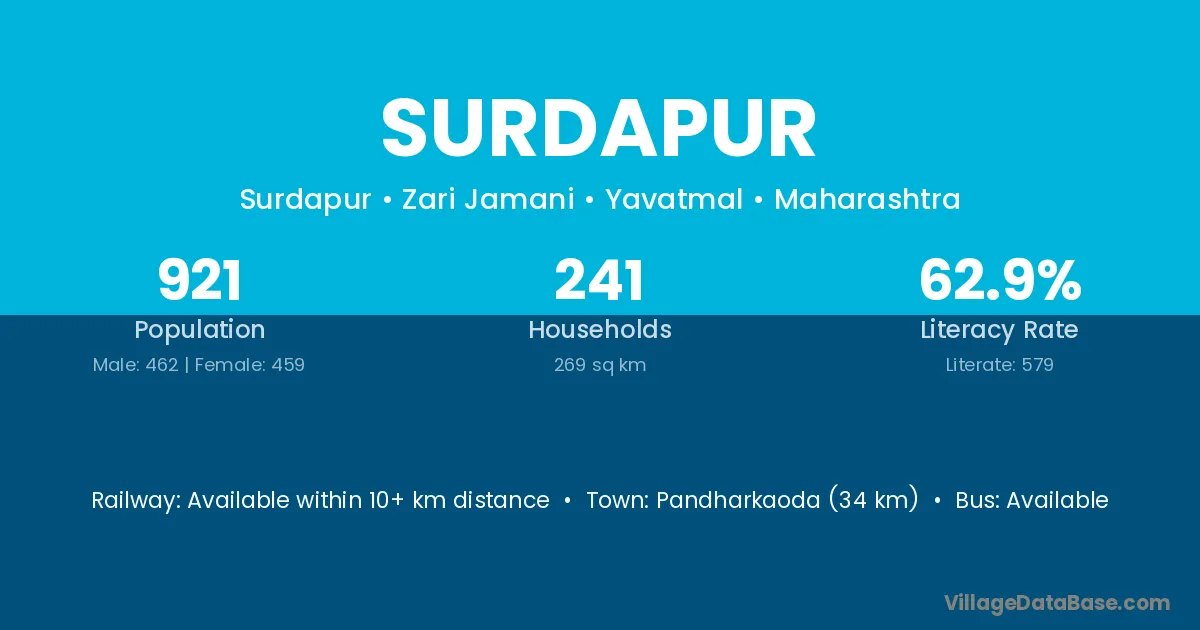 Kagaznagar (51 km) is the nearest town to Surdapur village for major economic activities and is located approximately 51 km away.