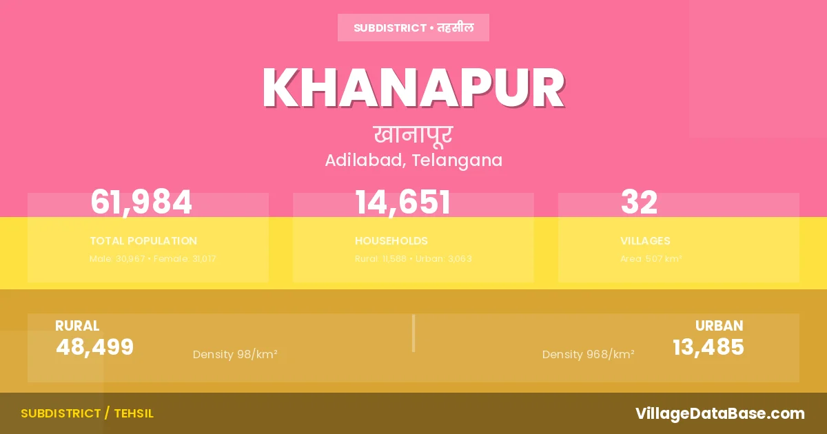 According to the 2011 census The total area of Khanapur Mandal is 507 km², with a population of 61984 people. The population density is 122 inhabitants per square kilometre, and there are approximately 14651 houses in the sub district.