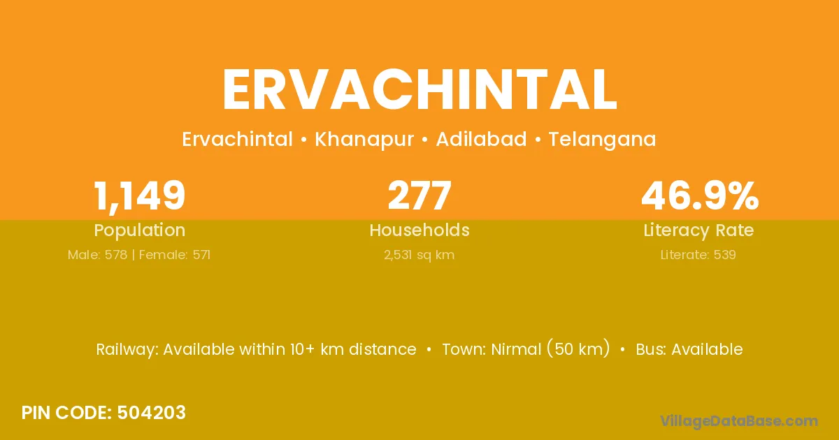 Nirmal (50 km) is the nearest town to Ervachintal village for major economic activities and is located approximately 50 km away.