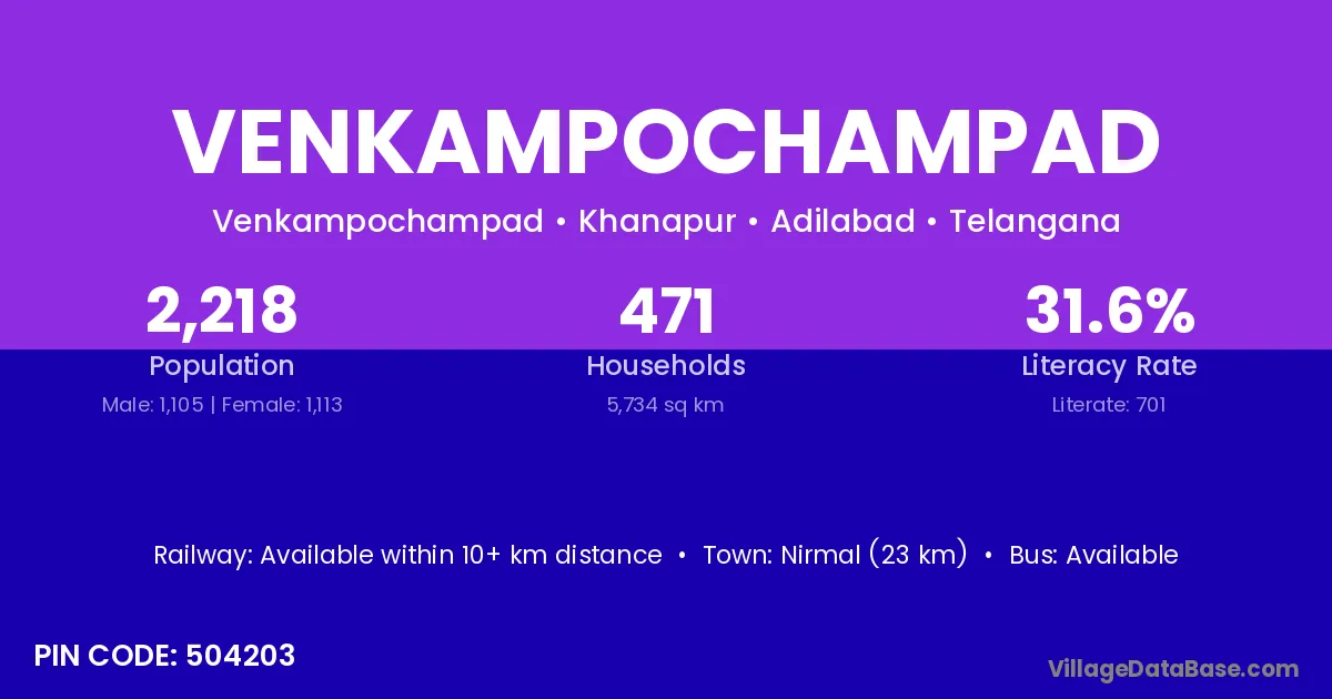 Nirmal (23 km) is the nearest town to Venkampochampad village for major economic activities and is located approximately 23 km away.