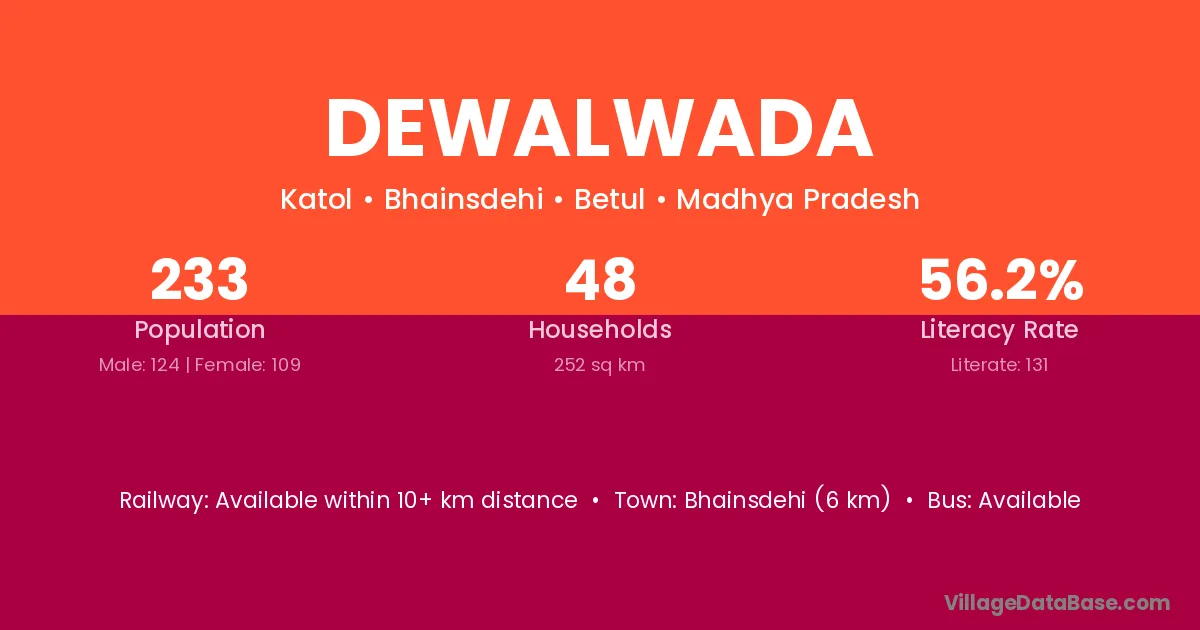 The literacy rate of Dewalwada village is 52.43%. Male literacy stands at 61.81% and female literacy at 42.92%.