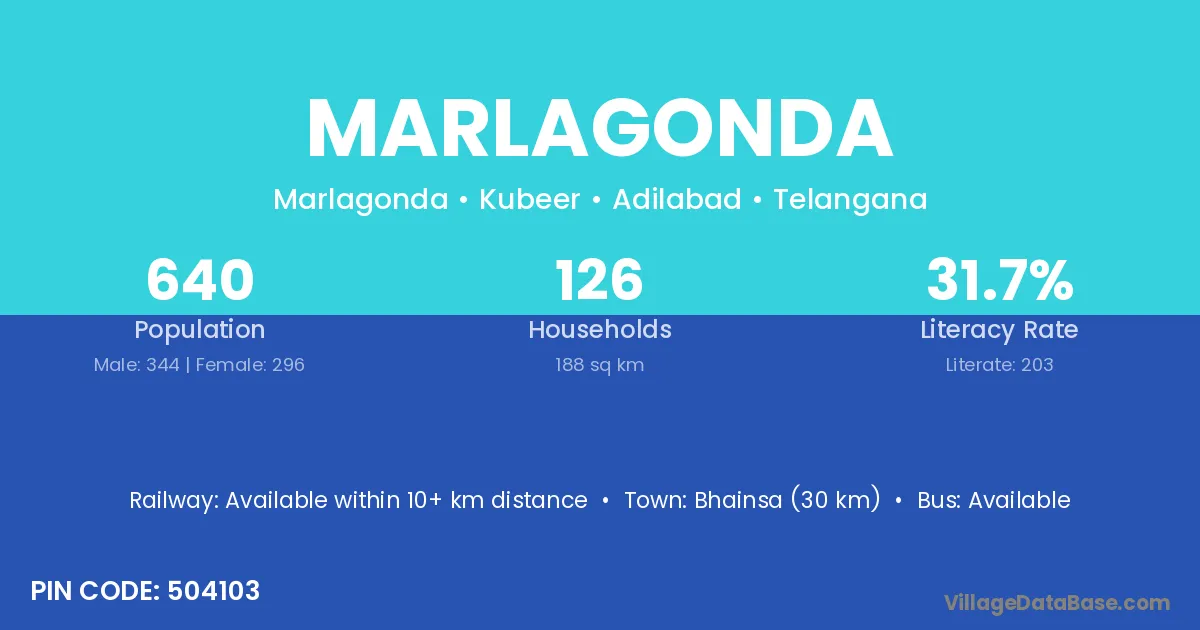 Bhainsa (30 km) is the nearest town to Marlagonda village for major economic activities and is located approximately 30 km away.
