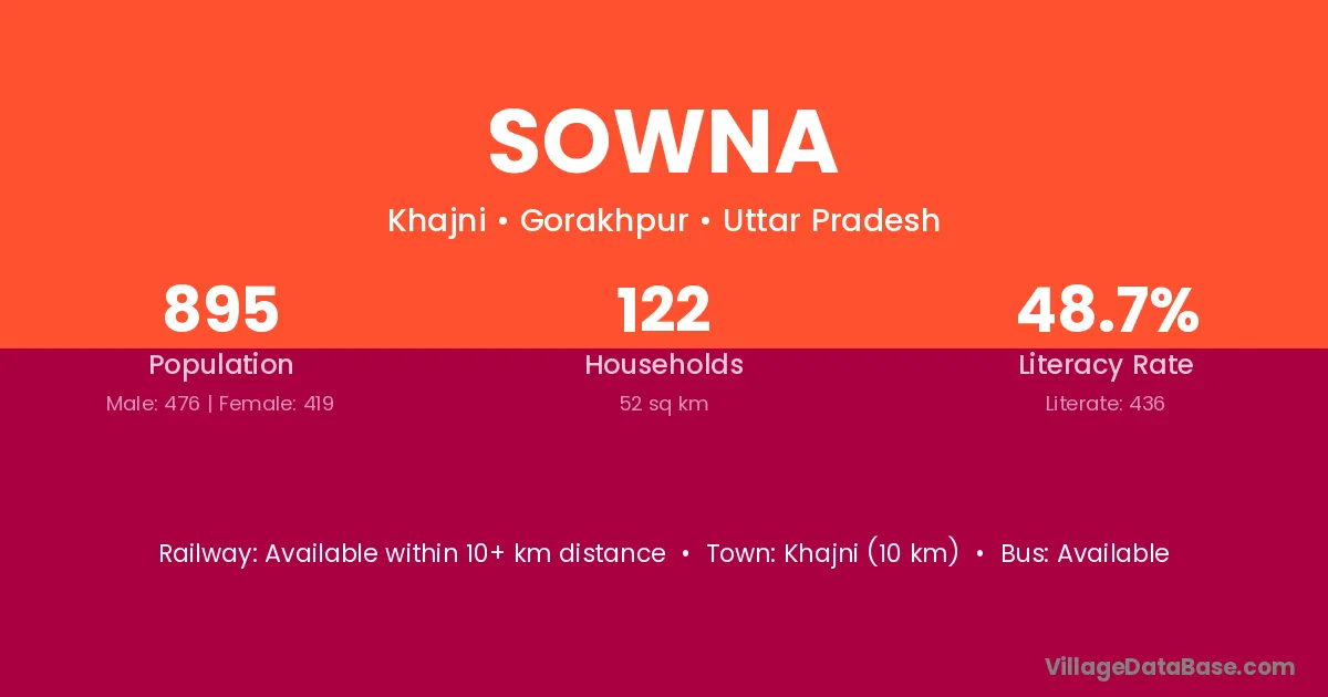The literacy rate of Sowna village is 45.24%. Male literacy stands at 53.30% and female literacy at 36.27%.