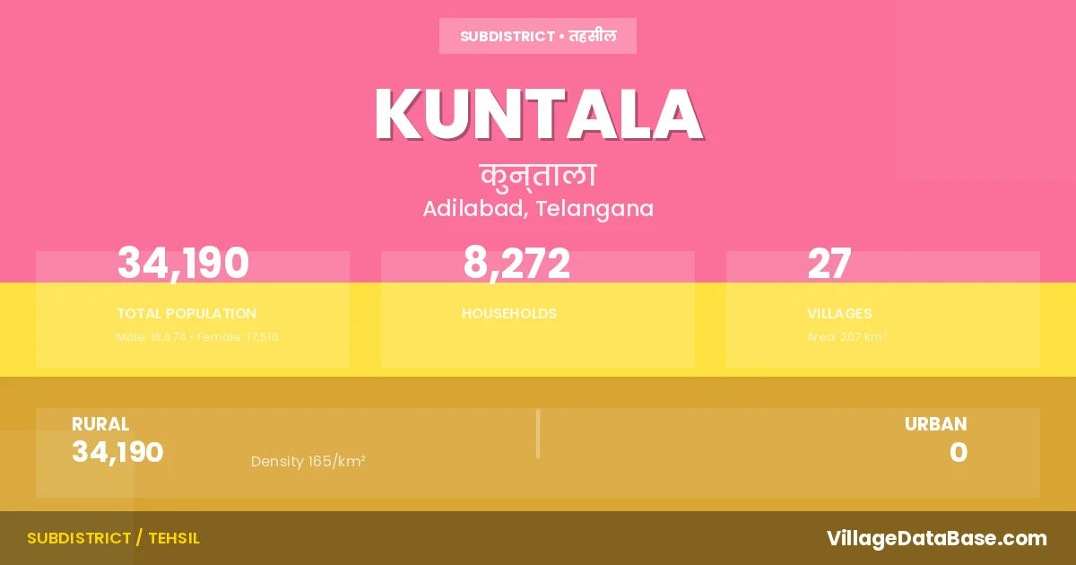 According to the 2011 census The total area of Kuntala Mandal is 207 km², with a population of 34190 people. The population density is 165 inhabitants per square kilometre, and there are approximately 8272 houses in the sub district.