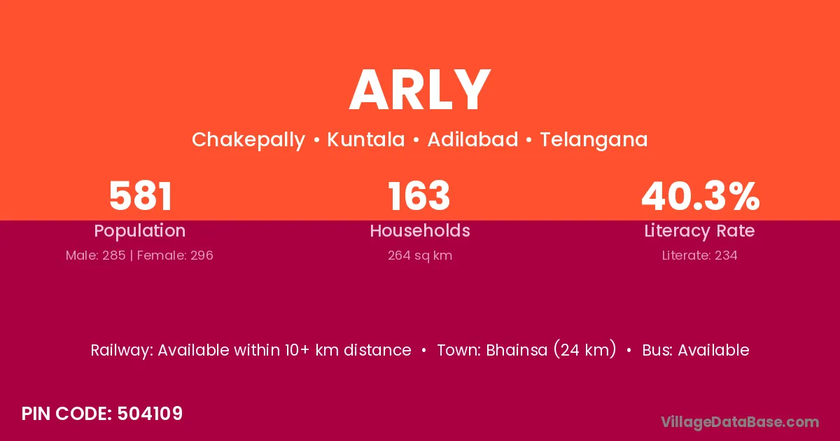 Bhainsa (24 km) is the nearest town to Arly village for major economic activities and is located approximately 24 km away.
