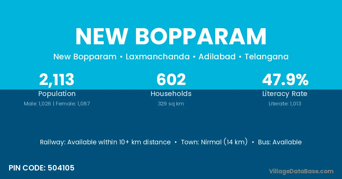 Nirmal (14 km) is the nearest town to New Bopparam village for major economic activities and is located approximately 14 km away.