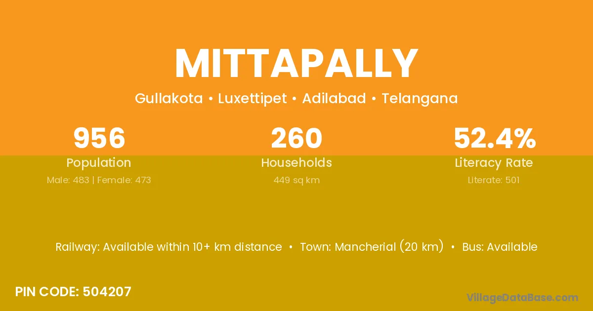 Mancherial (20 km) is the nearest town to Mittapally village for major economic activities and is located approximately 20 km away.