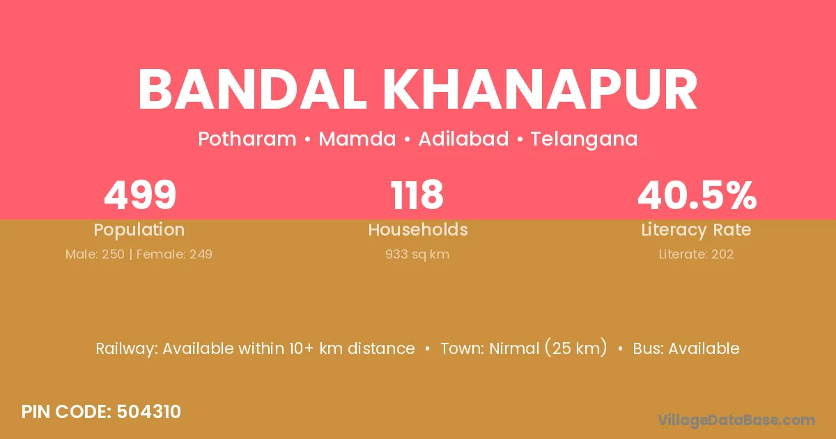 Nirmal (25 km) is the nearest town to Bandal Khanapur village for major economic activities and is located approximately 25 km away.