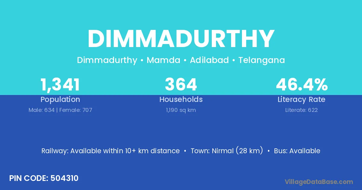 Nirmal (28 km) is the nearest town to Dimmadurthy village for major economic activities and is located approximately 28 km away.