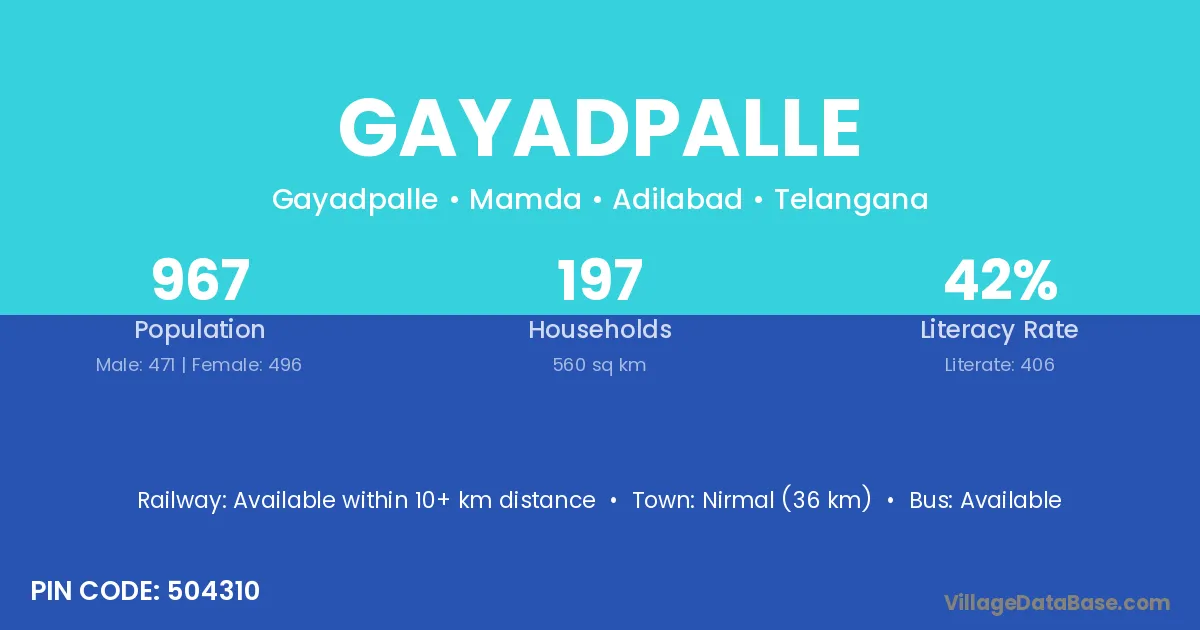 Nirmal (36 km) is the nearest town to Gayadpalle village for major economic activities and is located approximately 36 km away.