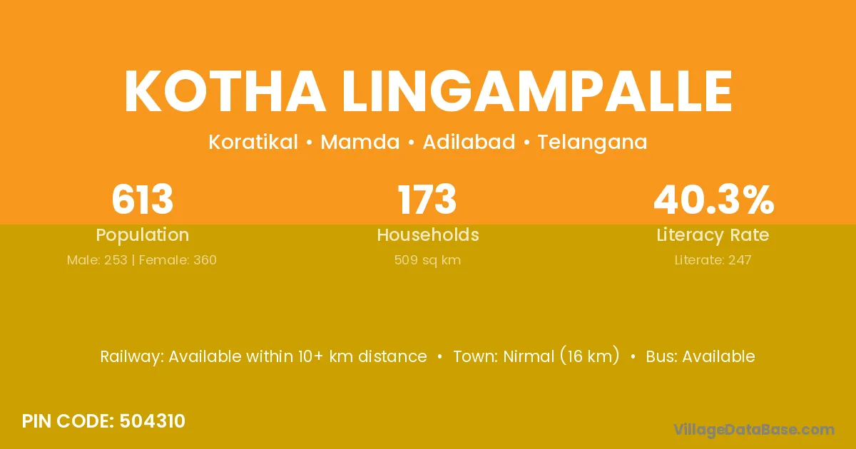 Nirmal (16 km) is the nearest town to Kotha Lingampalle village for major economic activities and is located approximately 16 km away.