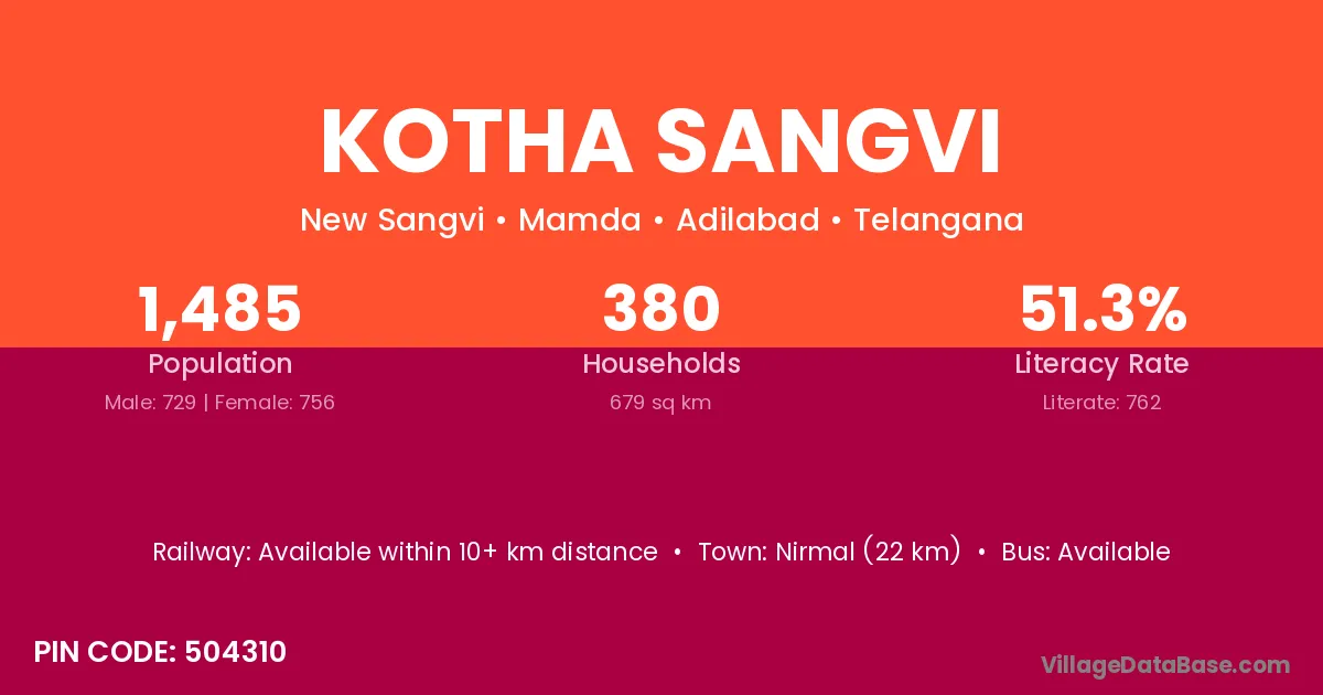 Nirmal (22 km) is the nearest town to Kotha Sangvi village for major economic activities and is located approximately 22 km away.