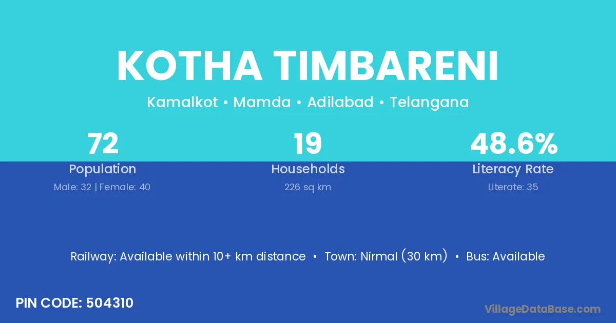 Nirmal (30 km) is the nearest town to Kotha Timbareni village for major economic activities and is located approximately 30 km away.