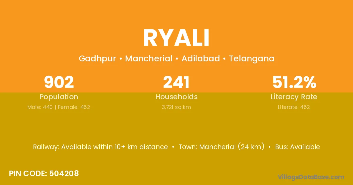 Mancherial (24 km) is the nearest town to Ryali village for major economic activities and is located approximately 24 km away.