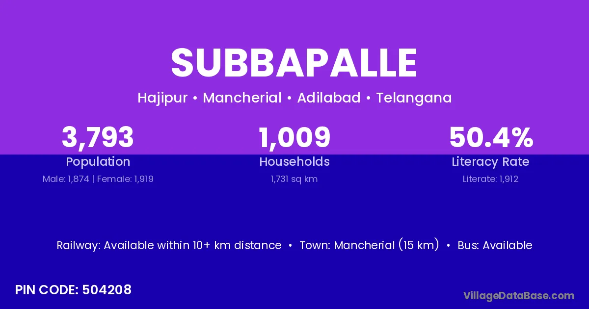 Mancherial (15 km) is the nearest town to Subbapalle village for major economic activities and is located approximately 15 km away.